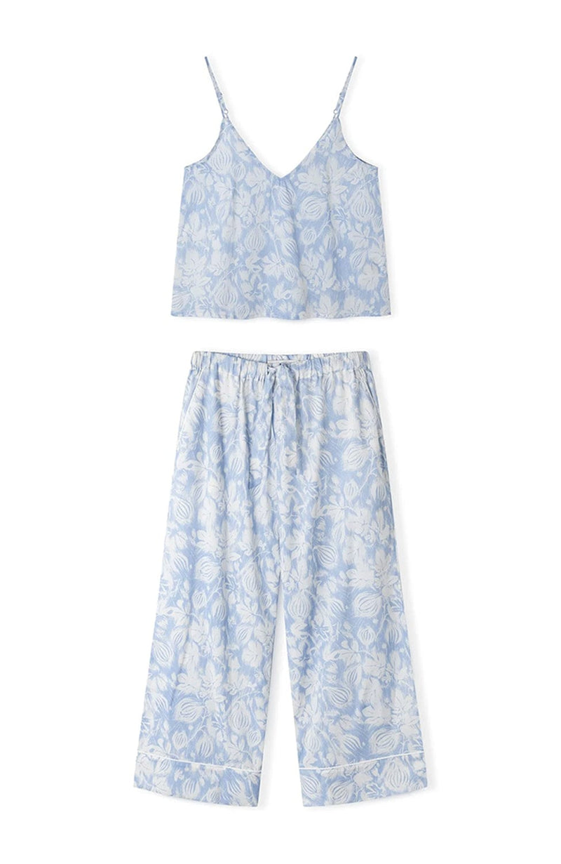 Elevate your summer style with the Alma Fig Cami and Wide Leg Set. Inspired by the fig tree's natural beauty, this set features hand-drawn artwork in the traditional ikat style. The Cami Top offers adjustable straps and a sophisticated neckline, while the Wide Leg Trousers provide both comfort and coolness. Perfect for luxury lovers.
