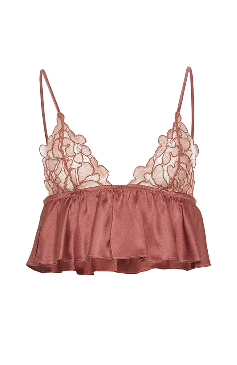 The Amelie Soft Bra in Rose Fauvee combines delicate lace detailing at the cups with a graceful satin flutter layer beneath, creating an effortlessly elegant silhouette. This piece balances refined aesthetics with comfortable, everyday wearability—perfect for those who appreciate understated luxury in their intimate wardrobe.
