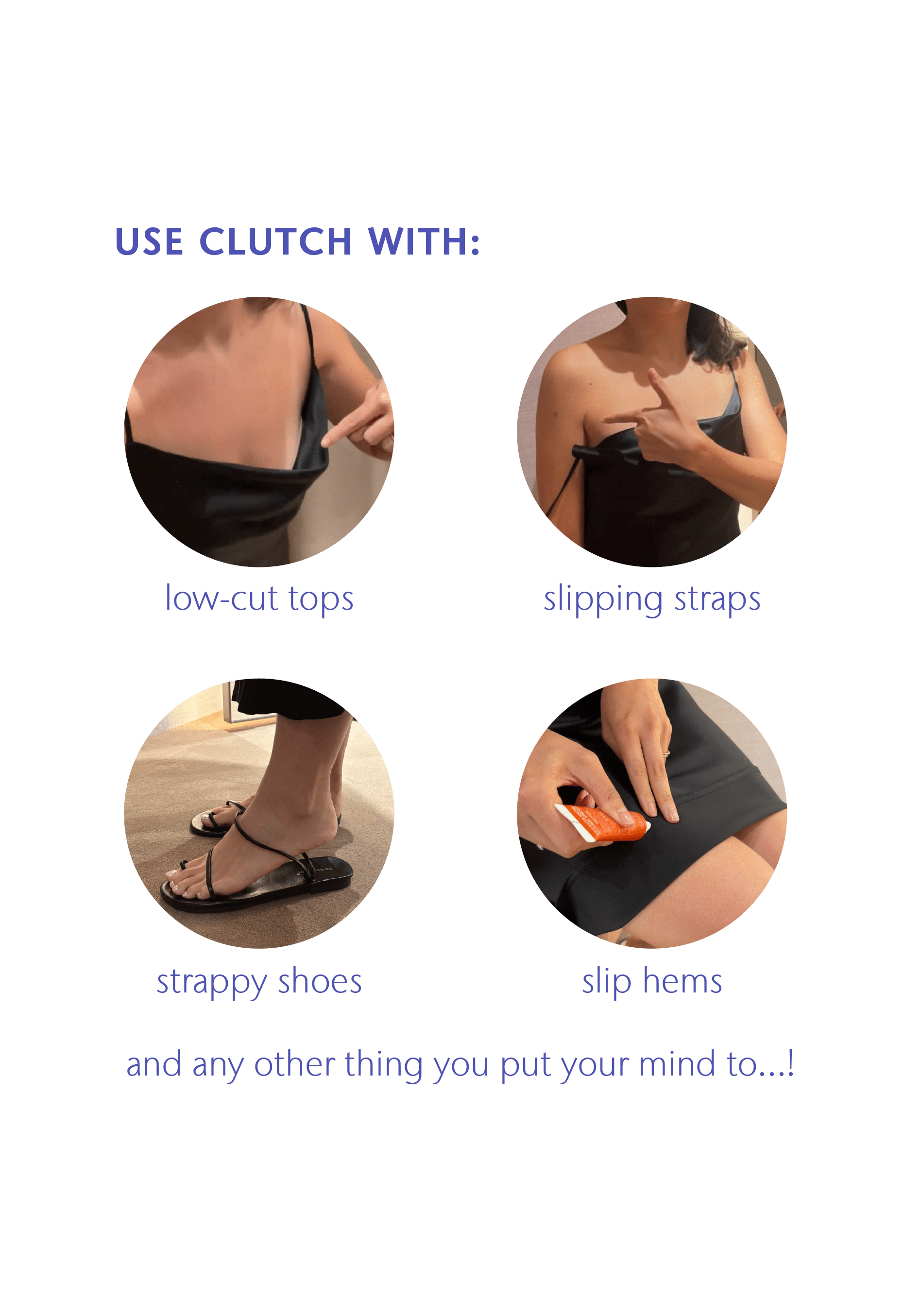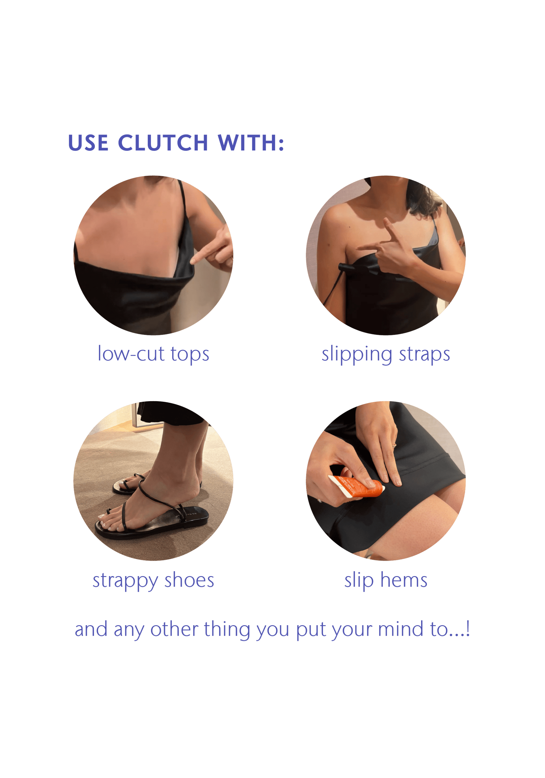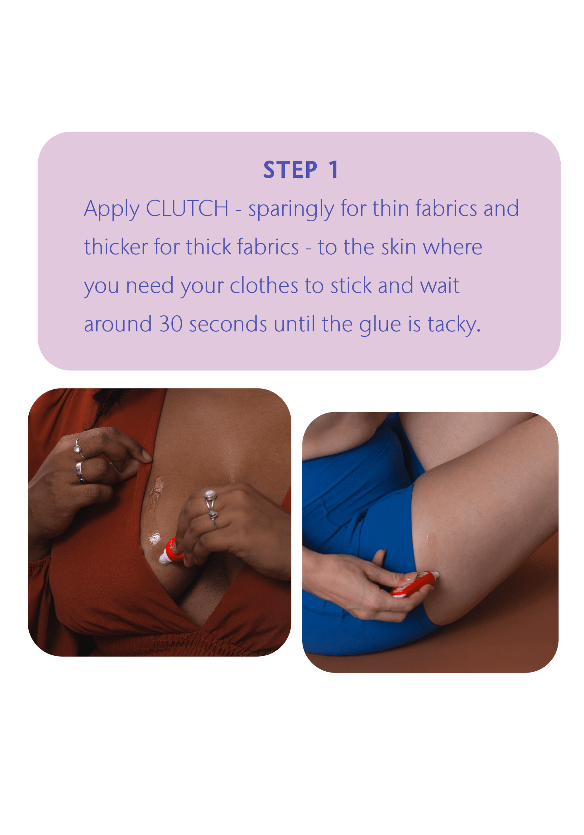 STEP 1: Apply CLUTCH to clean, dry skin where you’d like to stick your clothes. Use sparingly on delicates to prevent seepage and use a little more for a stronger hold on thicker fabrics.