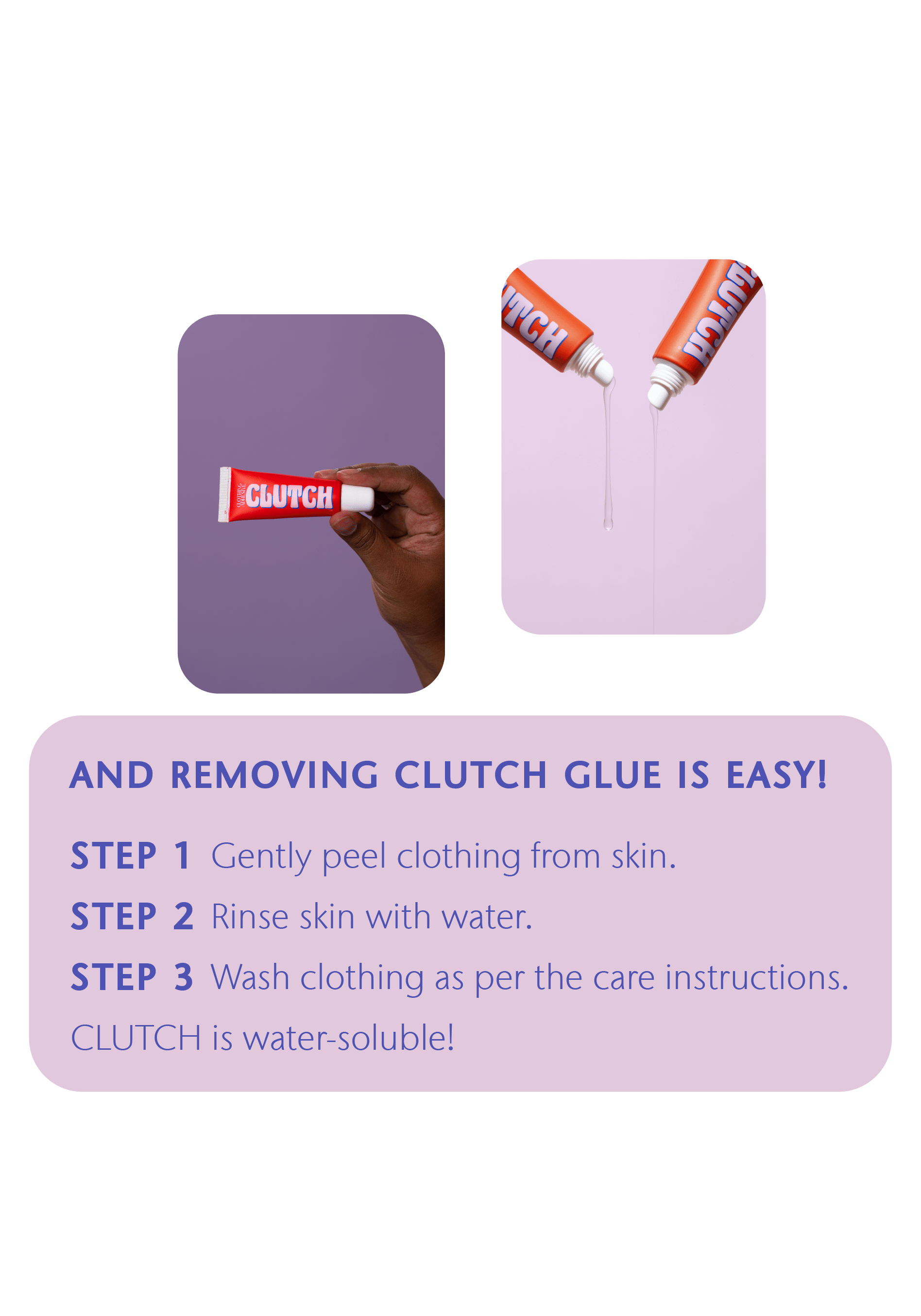 Introducing CLUTCH Glue - the ultimate solution for all your fashion needs. Forget struggling with non-sticking tape or dealing with skin irritation. Our specially designed formula bonds to your skin for as long as you need it to, and washes off easily from your favorite clothes. With CLUTCH Glue, wear your clothes exactly the way you want, every time.