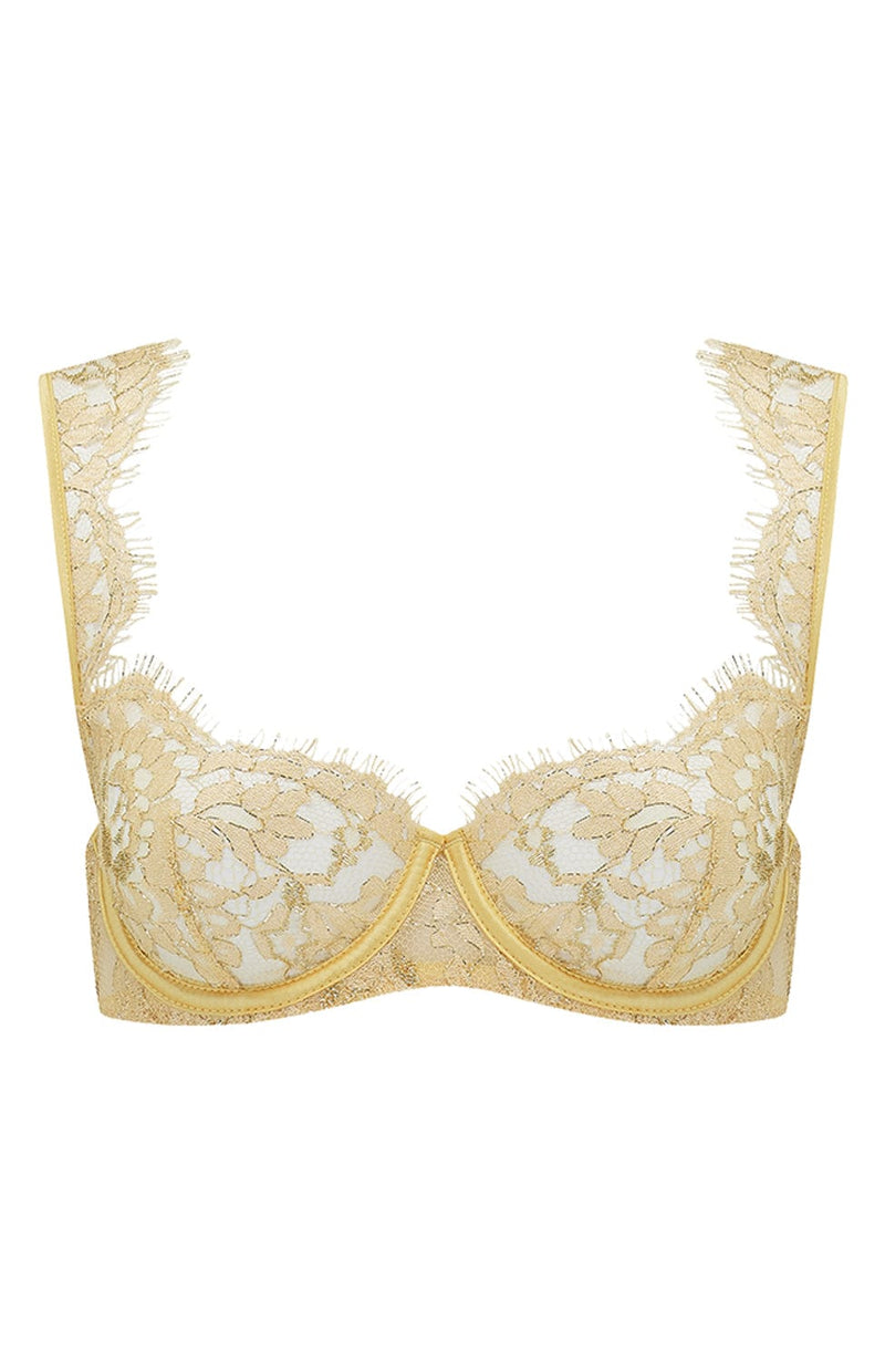 Indulge in pure luxury with the Fiorella Balcony Bra. Crafted from golden Leaver's lace with glistening lurex thread, this bra offers a classic balcony silhouette that graces the décolletage and shoulders. Silk-cased underwire provides gentle lift, while a wing of golden lace wraps around the body. Perfect for seasonal styling or as a breathtaking standalone piece.