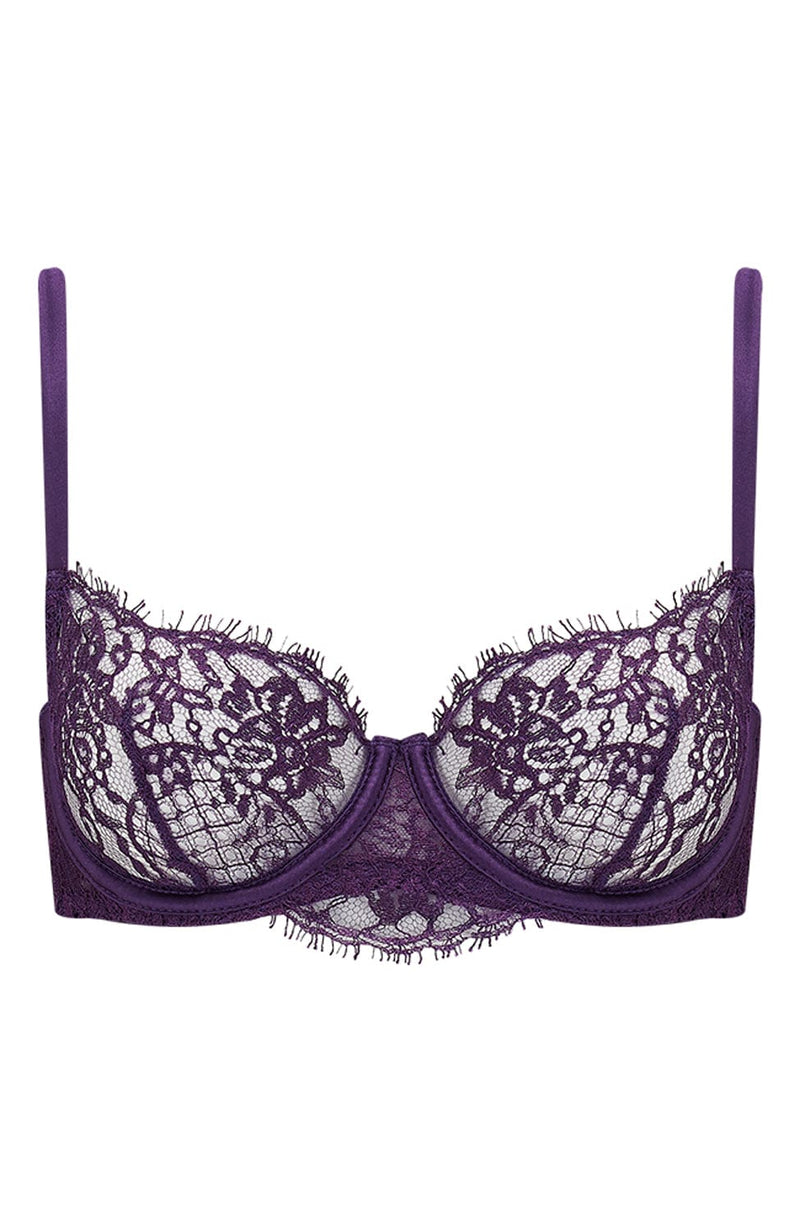 Indulge in elegance with the Hera Balcony Bra in Violet. Crafted with intricate French Leavers lace, this bra creates a beautifully flattering shape. Silk straps and wrapped lace add an extra touch of luxury, making this bra a must-have for any lingerie lover.