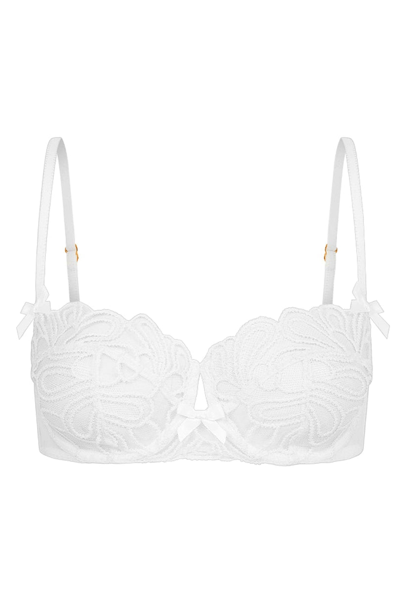 Sculpted from delicate daisy-embroidered Italian tulle, the Nelle Bra combines elegance with a hint of daring. Finished with subtle bows and refined gold hardware, it offers a graceful lift that defies convention. Designed to elevate both your silhouette and spirit, this bra pairs perfectly with the full Nelle set to bring a sophisticated edge to your everyday wardrobe.