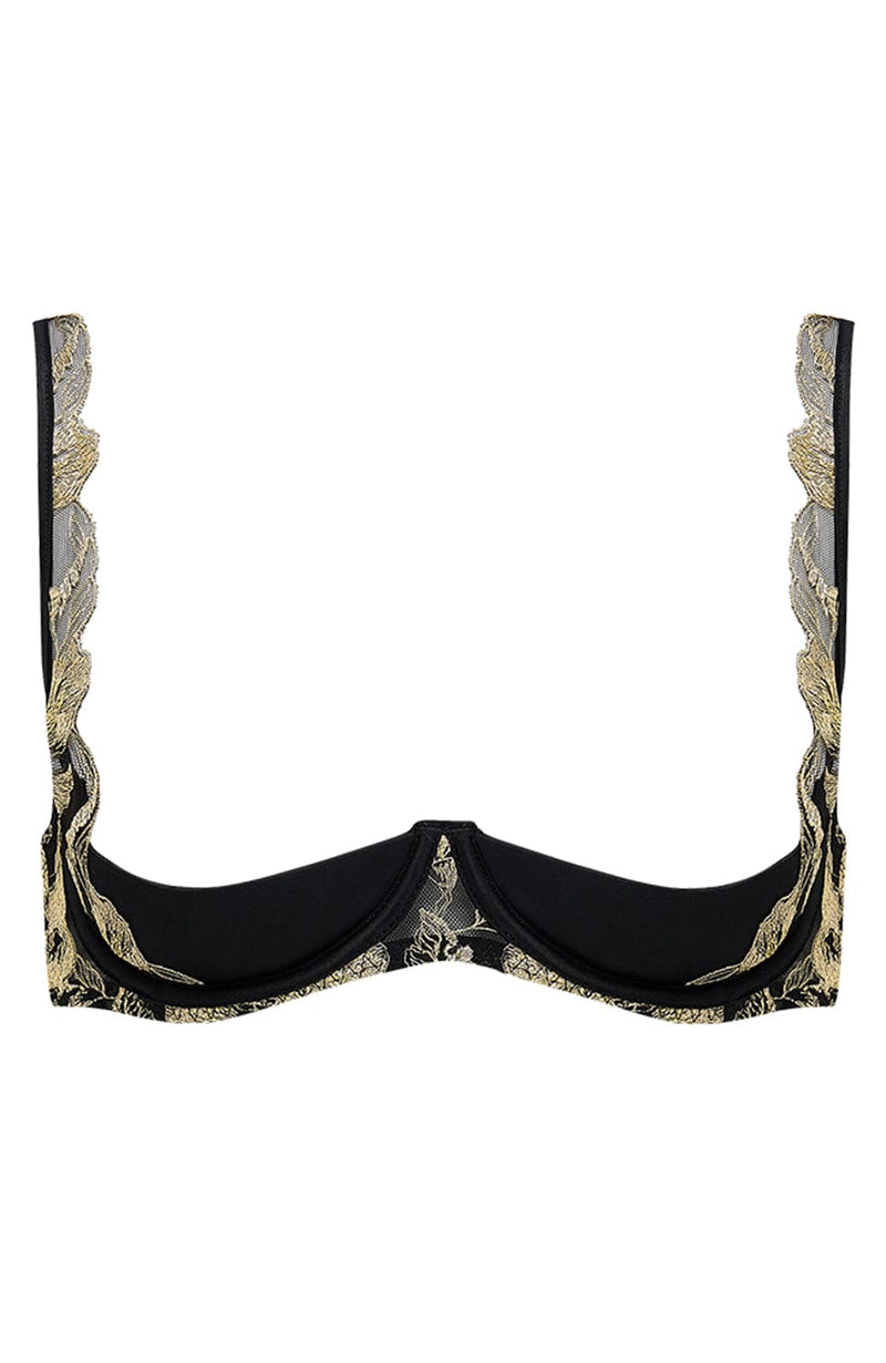 Indulge in a sense of opulent freedom with the Oriana Quarter Cup Bra. Crafted with decadent silk and delicate embroidery, this piece offers a seductive playfulness with its ouvert design. The silk-covered crescents provide lift and support, while the intricate gold floral embroidery adds a touch of drama. Embrace the elegance of the Baroque silhouette with the gold scalloped straps.