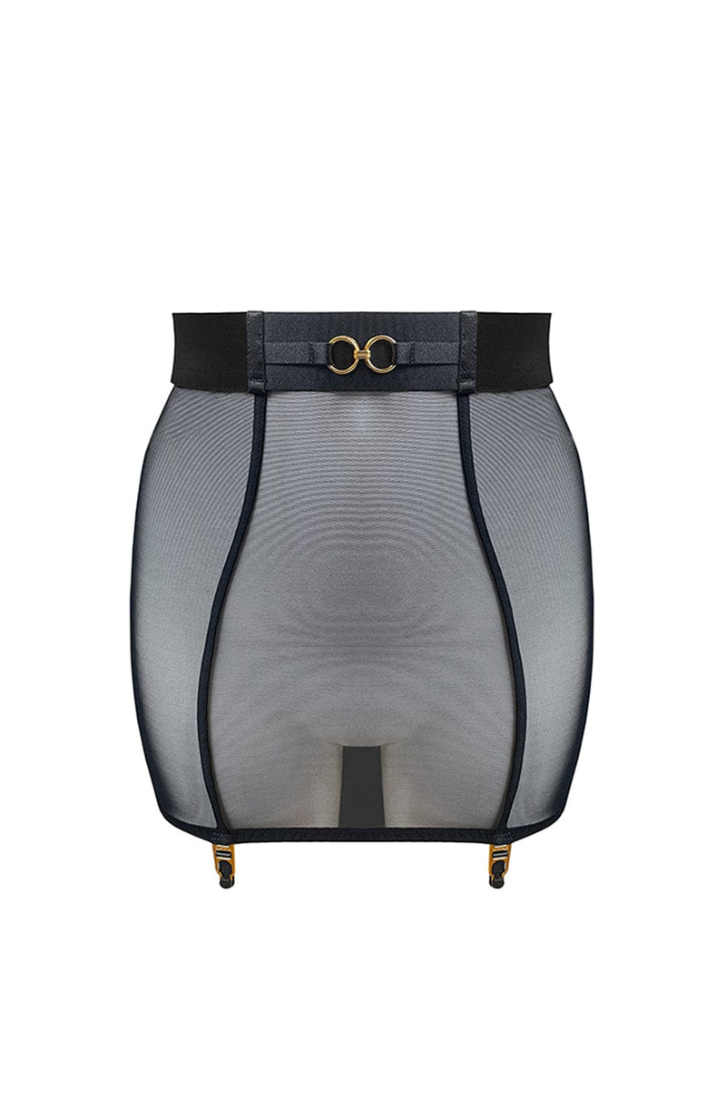 Indulge in the ultimate luxury with the Retta Skirt. This sheer mesh masterpiece is expertly designed to provide layering and contouring, while the soft wide band elastic belt adds a touch of elegance. The oversized 24k gold plated swan hook adds a regal touch, and the suspender clips provide versatile options for pairing with garters or stockings. Elevate your wardrobe with this exclusive piece.