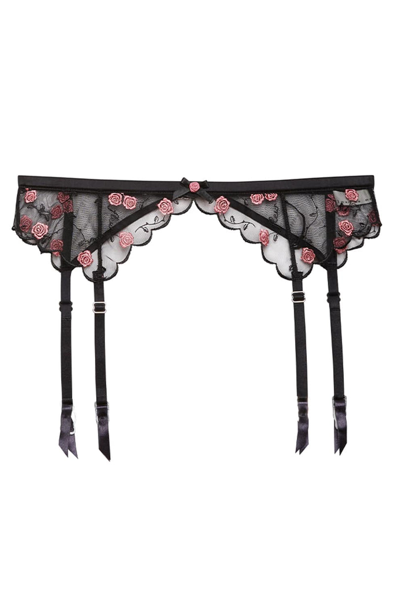 Enhance your lingerie collection with the Rose and Vine Embroidery Garter, a sophisticated piece featuring custom rose embroidery paired with the elegant Fleur logo script. Designed with silk-covered adjustable straps, an elastic waistband, and a center back closure at the waist for a secure fit. The delicate scalloped edge and rosette bow detail add a feminine touch, perfectly complemented by the matching Rose & Vine Embroidery Balconette Bra and Thong for a complete, refined set.