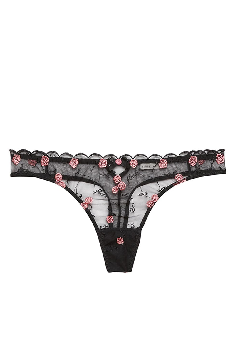 The Rose and Vine Embroidery Thong combines delicate craftsmanship with elegant design, featuring custom rose embroidery and the refined Fleur logo script. Accented by a charming rosette bow and a flirty scalloped legline, it offers a graceful silhouette. The sheer mesh back adds subtle allure, completing a sophisticated look. Pair it with the matching Rose & Vine Embroidery Balconette Bra and Garter Belt for a perfectly coordinated, luxurious lingerie set.